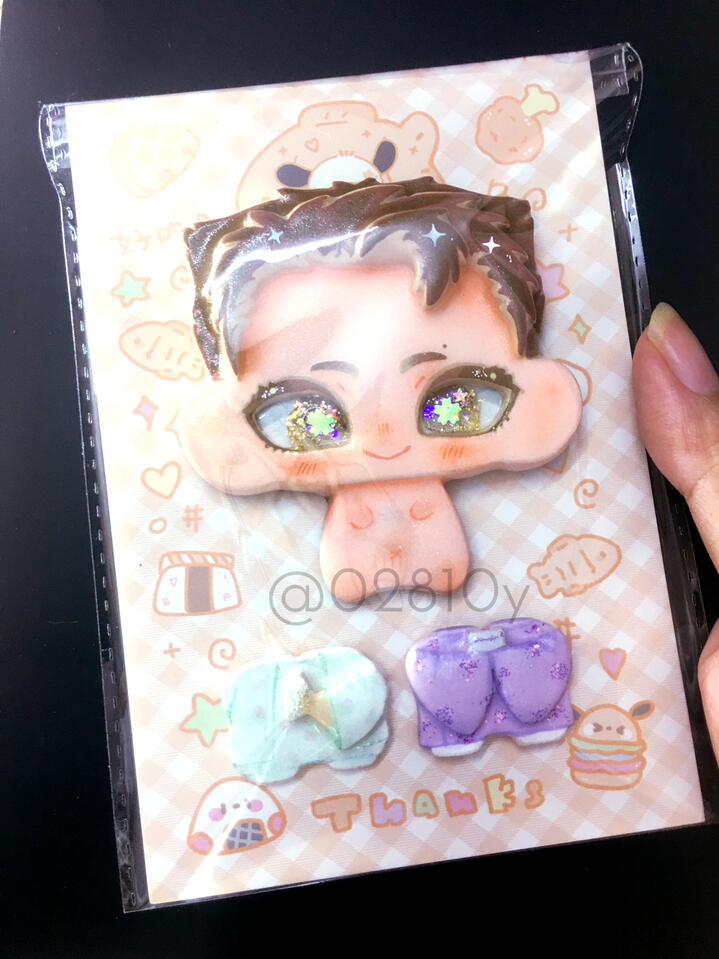 - Size: starts at 7cm height (without the extra ears and tail). Can increase max 3cm.- Pose: sitting, standing or Head only without body.- There are 3 types:Basic :1 layer of clay with hand-drawing face. Hair layers and clothes.3d sequin eyes :2 layers of clay to make 3d eyes effect, eyes are decorated with sequin instead of drawing. Hair layers and clothes.Shakey body : seperated body and head, the body can shake left and right with sequin eyes. No detachable outfit for this option.- This is 100% handmade, made with Ladoll airdry Clay, painted with acrylic, coated with resin and 1 more layer of glitter sprayed paint.- Can be used as a decorated magnet or a keychain, depends on your choice.- Price:Basic: $40 (+$8/cm for upsize, max 3cm)3d eyes: $45 (+$10/cm for upsize, max 3cm)Shakey body: $60 (+$15/cm for upsize, max 3cm)Detachable clothes (with magnet): $10/ pieceAdditional details: starts at $5 (glasses, tie, ribbon, etc...)- I only do a basic sketch and then start working with clay right after so there is no drawing fee ^^- Will take 1 week or more to finish the product.